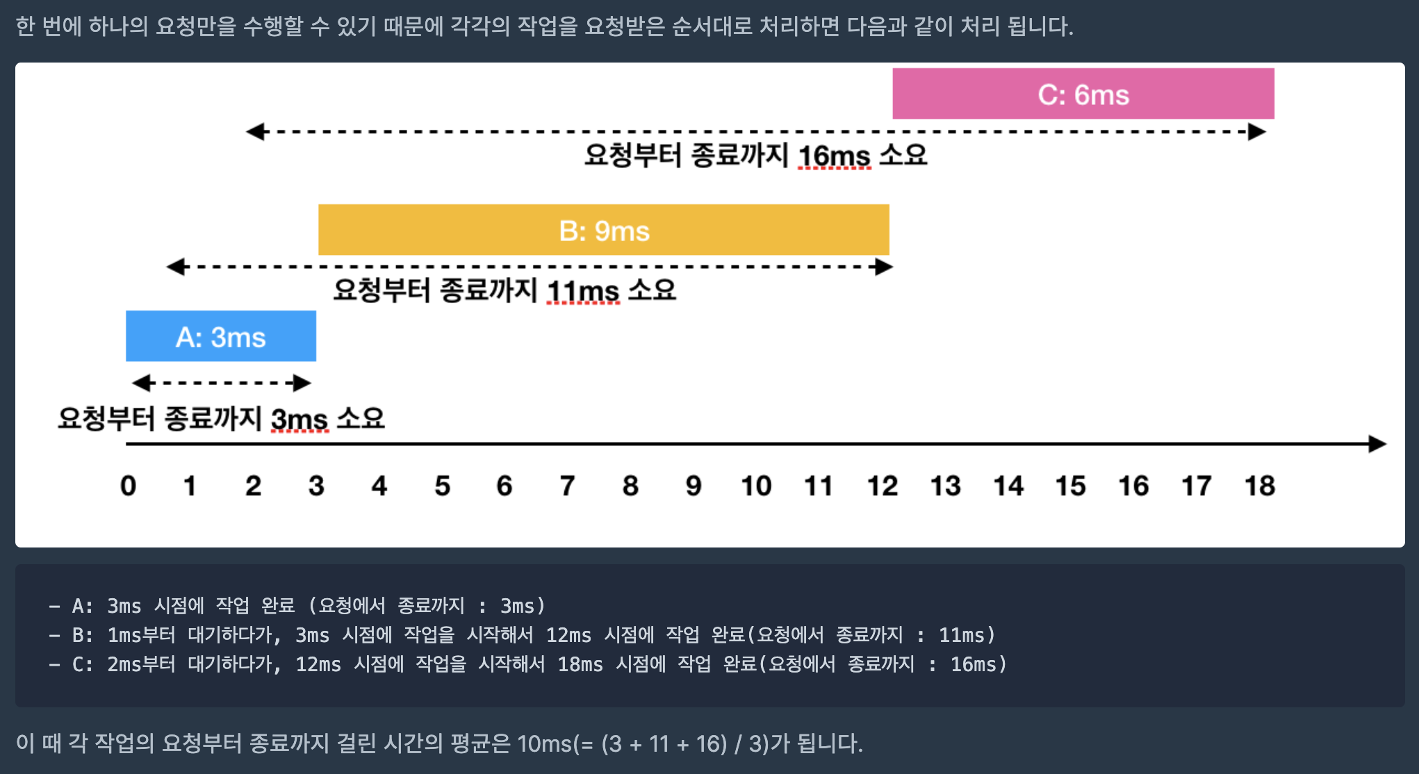 하드디스크는 한 번에 하나의 작업만 수행할 수 있습니다. 디스크 컨트롤러를 구현하는 방법은 여러 가지가 있습니다. 가장 일반적인 방법은 요청이 들어온 순서대로 처리하는 것입니다. 예를들어 - 0ms 시점에 3ms가 소요되는 A작업 요청 - 1ms 시점에 9ms가 소요되는 B작업 요청 - 2ms 시점에 6ms가 소요되는 C작업 요청 와 같은 요청이 들어왔습니다. 이를 그림으로 표현하면 아래와 같습니다. 한 번에 하나의 요청만을 수행할 수 있기 때문에 각각의