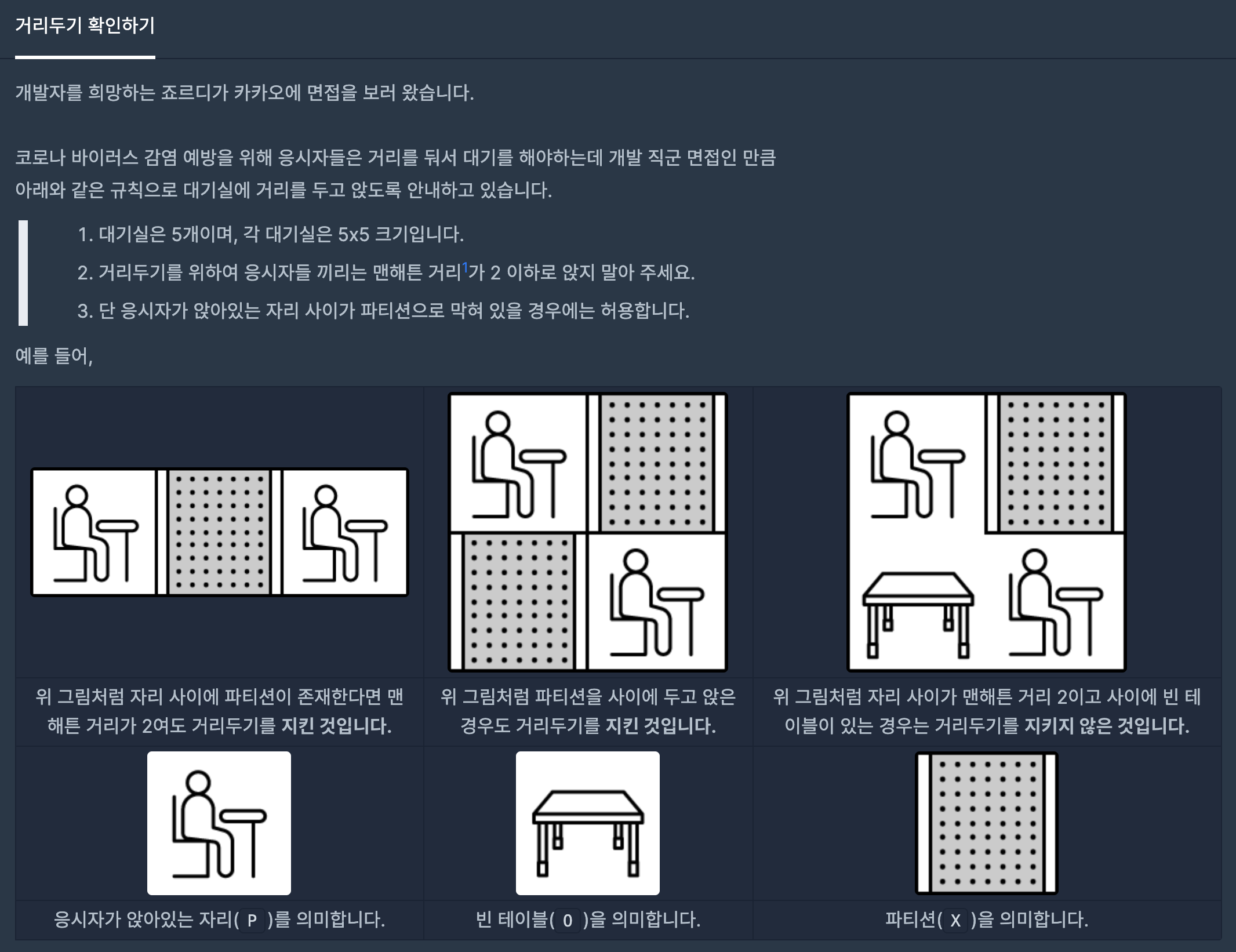 https://programmers.co.kr/learn/courses/30/lessons/81302 코딩테스트 연습 - 거리두기 확인하기 [["POOOP", "OXXOX", "OPXPX", "OOXOX", "POXXP"], ["POOPX", "OXPXP", "PXXXO", "OXXXO", "OOOPP"], ["PXOPX", "OXOXP", "OXPOX", "OXXOP", "PXPOX"], ["OOOXX", "XOOOX", "OOOXX", "OXOOX", "OOOOO"], ["PXPXP", "XPXPX", "PXPXP", "XPXPX", "PXPXP"]] [1, 0, 1, 1, 1] programmers.co.kr 간단한 그래프 문제. 5 * 5 배열 조건이라서 연산량이 그렇게 많지는 않다. dfs / ..