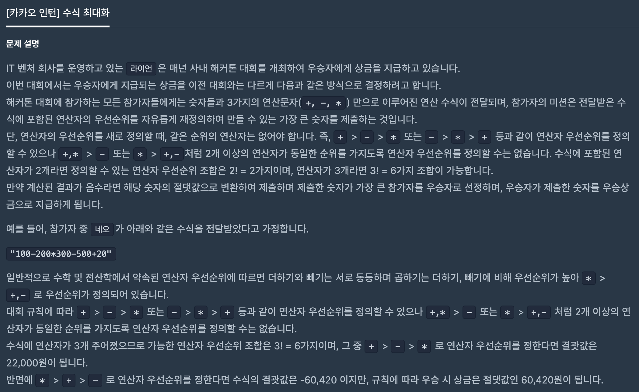 https://programmers.co.kr/learn/courses/30/lessons/67257 코딩테스트 연습 - 수식 최대화 IT 벤처 회사를 운영하고 있는 라이언은 매년 사내 해커톤 대회를 개최하여 우승자에게 상금을 지급하고 있습니다. 이번 대회에서는 우승자에게 지급되는 상금을 이전 대회와는 다르게 다음과 � programmers.co.kr 이 문제도 시험 당시에는 제대로 못 풀었었다. 재귀를 활용한 분할정복으로 접근해야 하는 문제. 1. 문자열을 우선순위 문자열을 기준으로 분리한다. 2. 분리한 문자열을 다음 우선순위 문자열을 기준으로 분리한다. 3. 가장 마지막 우선순위 문자열에 도착했으면, 연산한 결과를 문자열 형태로 리턴한다. 100-200*300-500+20 이고 연산 우선순위가 (*..